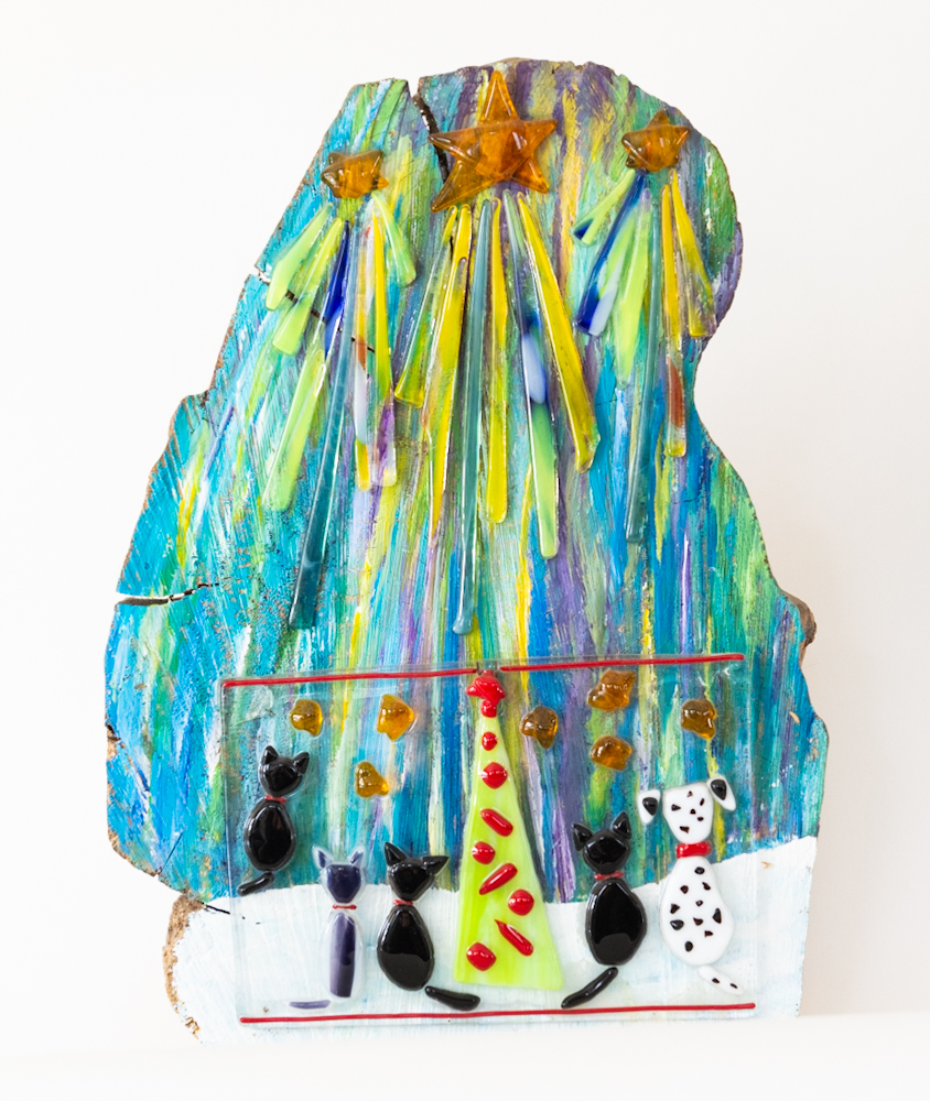 Her original oil paintings depict life here in the Maritimes, in a slightly impressionistic style. Her one of a kind fused glass creations follow more of a folk art tradition, and are guaranteed to make you smile.
